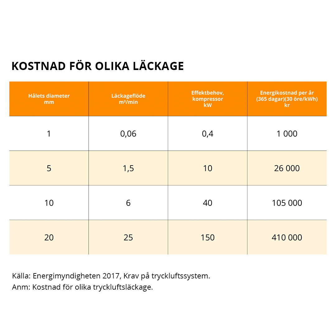 Tryckluft är en kostsam energiform där vanligen 20-40% går om intet i förlorat läckage.