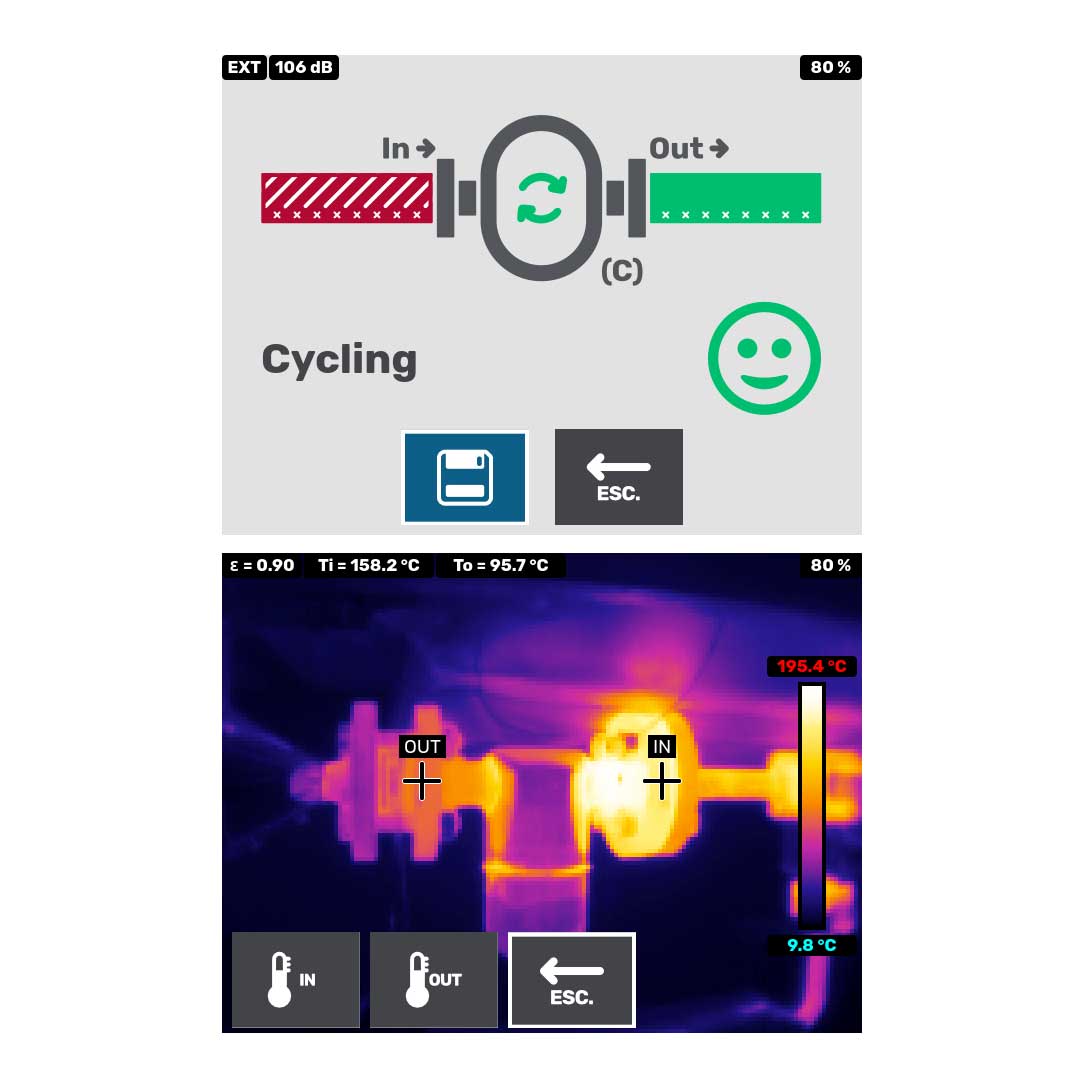 Den inbyggda värmekameran mäter ingående och utgående temperatur på dina ångfällor och med en extern ultraljudssensor kontrolleras ångfällans funktion. Leakshooter V3+Pro är marknadens mest kompletta mätverktyg för analys och funktionskontroll av ångfällor.